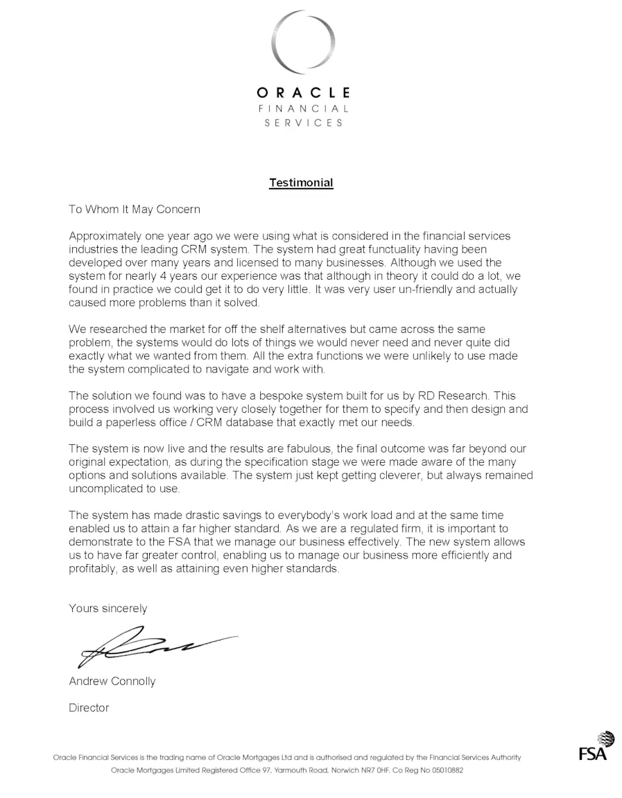 Oracle asked RD Research to design and build a bespoke CRM and paperless office system that would fit the way they actually worked.