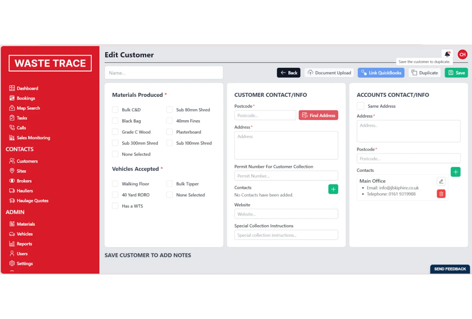 We developed the CRM and call workflows first, then the booking engine and haulier allocation, followed by weighbridge ticket handling and QuickBooks integration. Data migration moved active customers and opportunities into Waste Trace, with de-duplication rules to clean contacts. Pilot users tested each module before being made live.